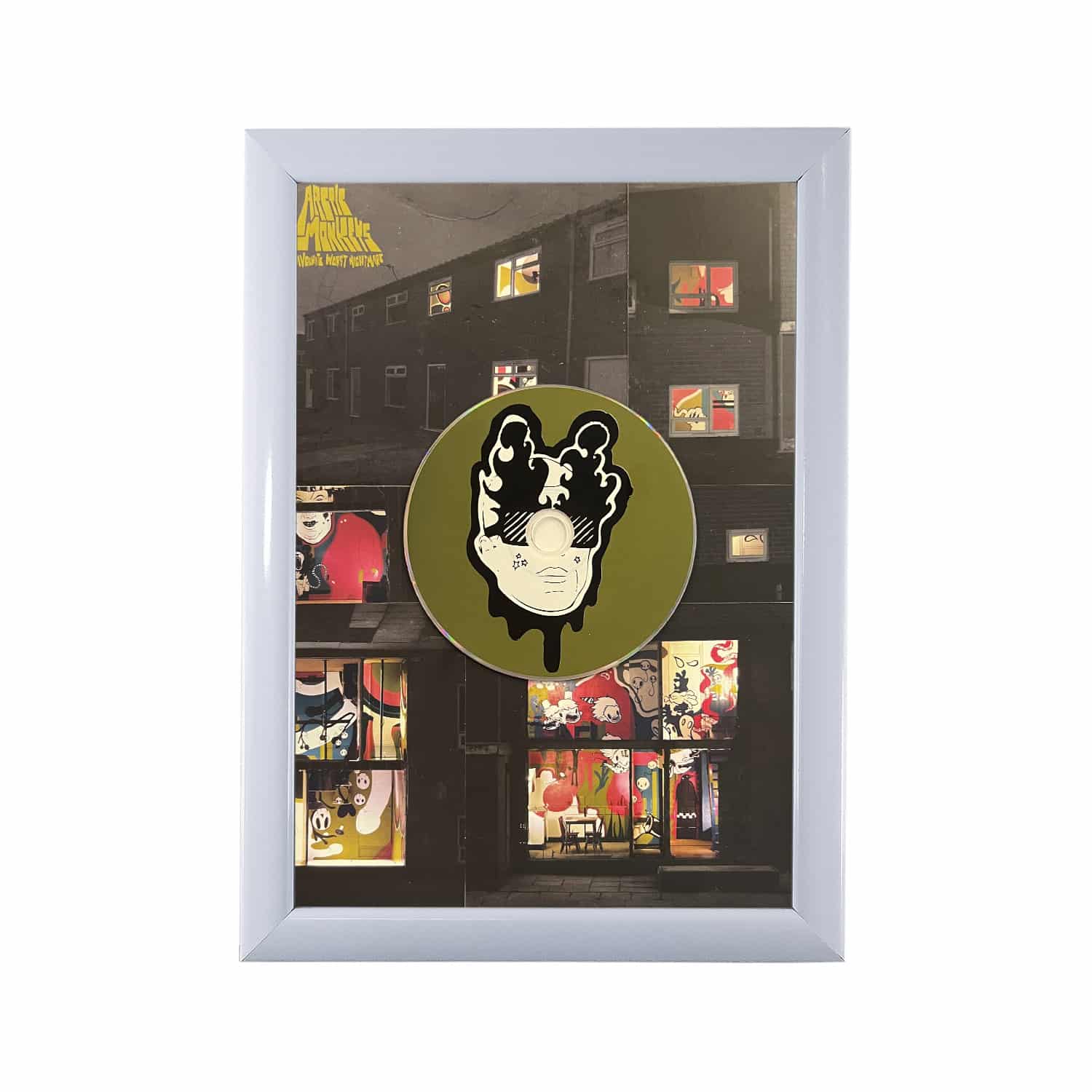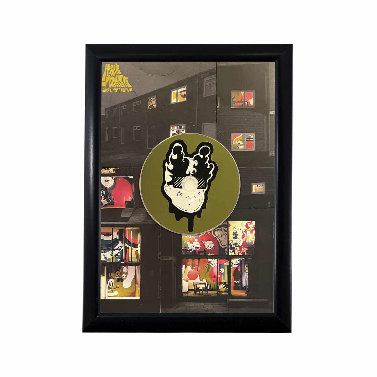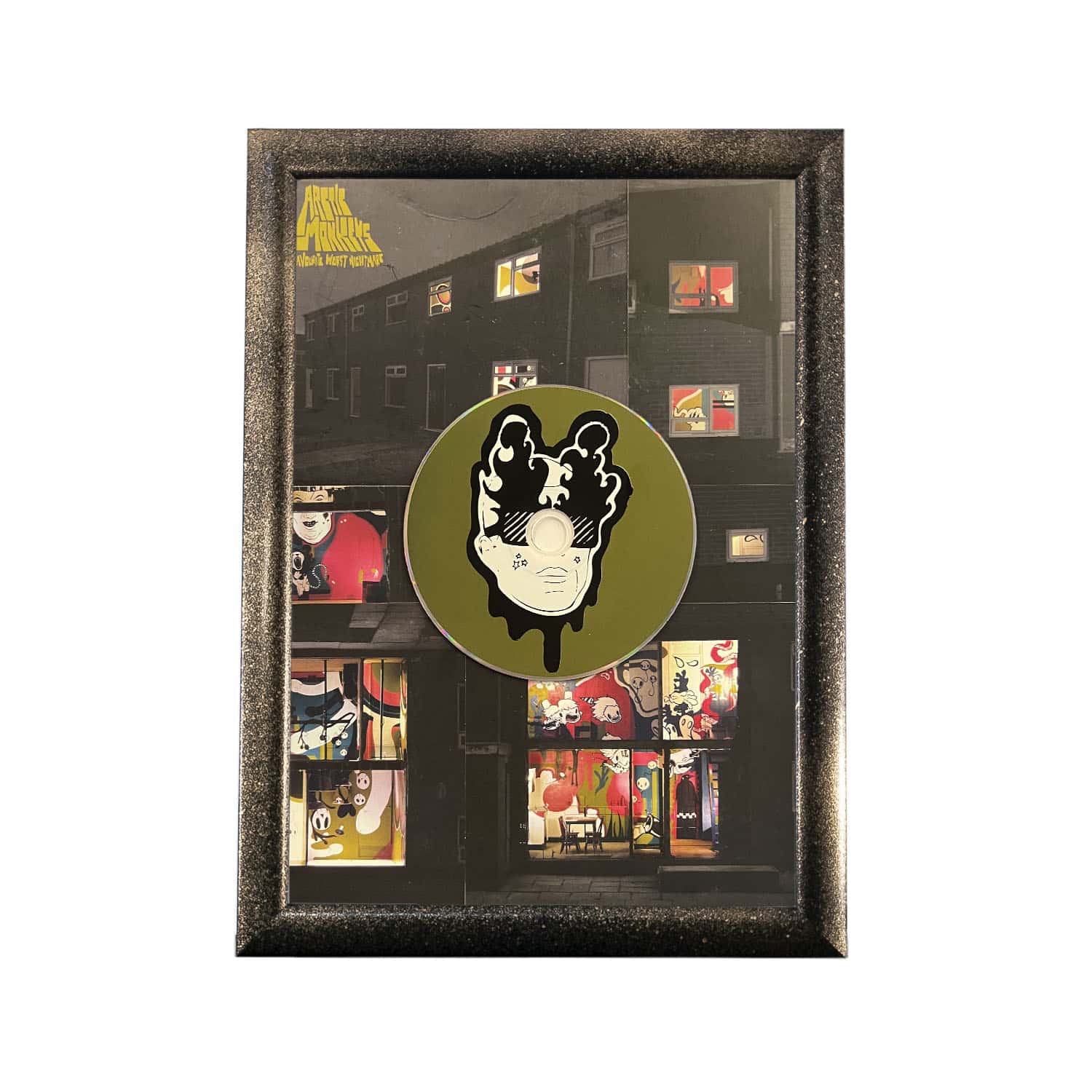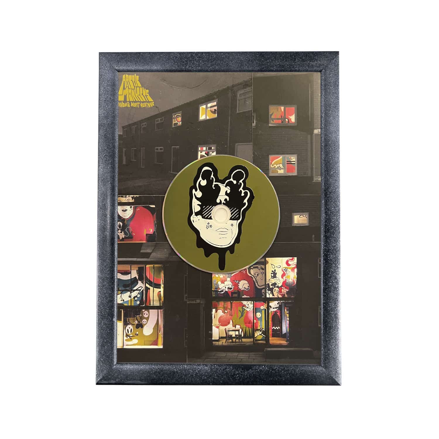 הדיסקים והתקליטים דבוקים לרקע העיצוב ולא ניתנים להוצאה מהמסגרת והאזנה.